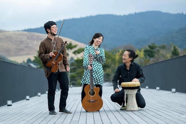 ギタリストの牧野由希子、アラブヴァイオリン奏者の秦進一、ダルブッカ奏者の森内清敬の
